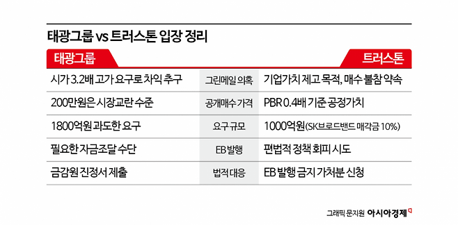 "주당 200만원 매입·소각" 제안한 트러스톤…고가 매수 요구 논란양측의 이번 갈등은 태광산업 이사회가 지난달 27일 자사주 전량(약 24.4%)을 기초로 EB 발행 결정을 내린 데 트러스톤 측이 강력 반발하며 시작됐다. 트러스톤은 곧바로 이사의 충실의무 위반이라며 법원에 가처분을 신청했고, 금융당국 지적까지 받은 태광산업은 EB 발행을 잠정 보류했다.
