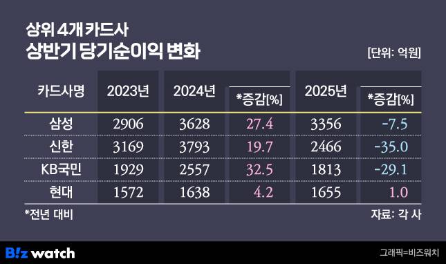 삼성카드는 올해 상반기 순이익이 3356억원으로 상위 4개 카드사(삼성·신한·KB국민·현대카드) 중 1위를 기록했다. 업계 2위인 신한카드(2466억원)보다 890억원 앞섰고 KB국민카드(1813억원), 현대카드(1655억원)와도 1000억원 이상의 격차를 냈다.