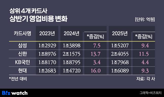 실제 현대카드의 상반기 영업수익은 1조8245억원으로 삼성카드(2조714억원)보다 2469억원 적었다. 그러나 같은 기간 현대카드의 영업비용(1조6089억원)은 삼성카드(1조5207억원)보다 882억원이나 많았다.
