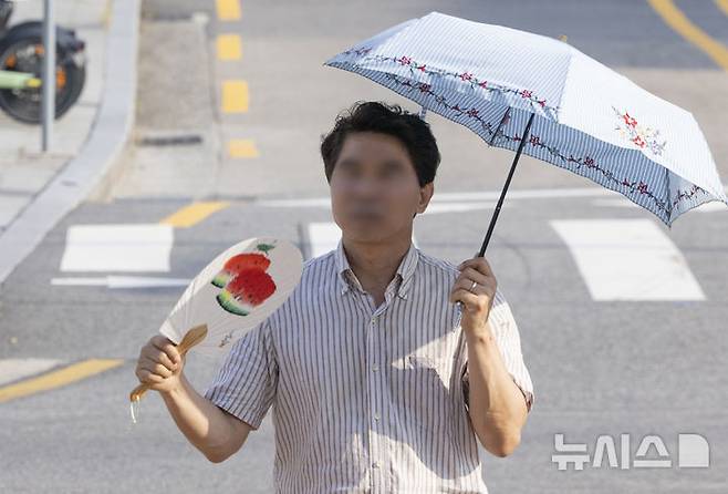 [서울=뉴시스] 김근수 기자 = 기록적인 폭염이 이어진 30일 오전 서울 서초구 고속버스터미널 인근에서 한 시민이 부채로 더위를 식히며 양산을 쓴 채 출근길에 나서고 있다. 2025.07.30. ks@newsis.com