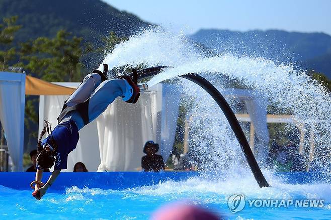 (인제=연합뉴스) 지난 29일 강원 인제군 남면 빙어호 일원에서 열린 '여름愛 인제愛 빠지다' 여름 축제 현장에서 플라이보드 세계 챔피언 박진민 선수가 관광객들에게 공연을 선보이고 있다. 2025.7.30 [인제군 제공. 재판매 및 DB 금지]