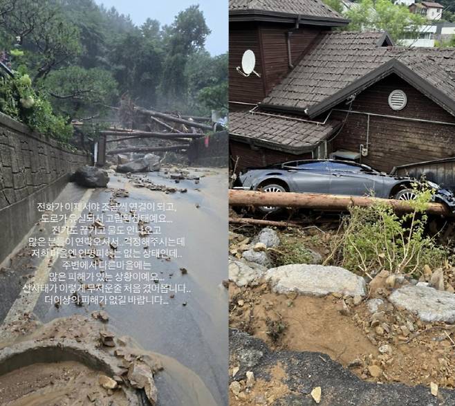 이어 "전기도 끊기고 물도 안나온다"며 "많은 분들이 연락 오셔서 걱정해 주시는데 저희 마을엔 다행히 인명피해는 없는 상태"라고 전했다. 하지만 "주변 다른 마을에는 많은 피해가 있는 상황"이라며 "산사태가 이렇게 무서운 줄 처음 겪어 본다. 더 이상의 피해가 없길 바란다"고 빌었다.