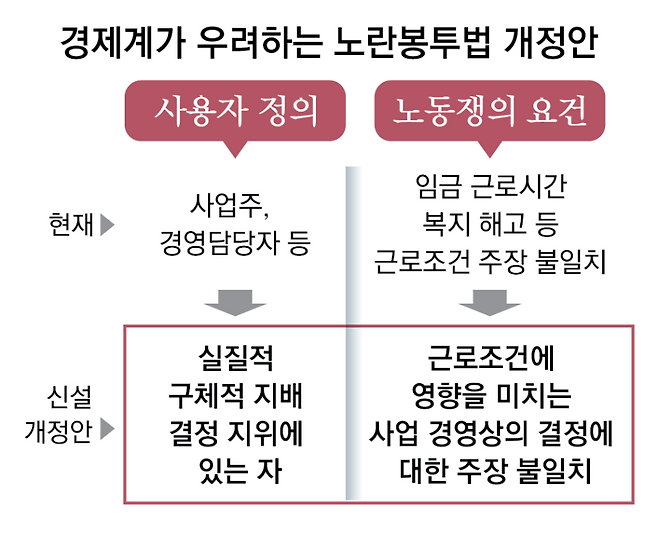 경제8단체도 공동 입장문에서 노란봉투법에 대해 “사용자 범위가 확대되고, 기업 고유의 경영활동까지도 쟁의 대상에 포함돼 파업 만능주의를 조장하고 노사관계 안정성도 훼손되는 등 심각한 부작용이 우려된다”며 “깊은 우려를 넘어 참담한 심정을 금할 수 없다”고 했다.