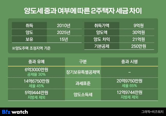 B씨는 2026년 7월 송파구 잠실동에 다른 아파트를 30억원에 취득했다. 1세대2주택자가 된 B씨가 기존에 실거주하지 않고 보유한 서울 서초구 아파트를 2026년 7월 25억원에 판다면 중과 시행과 아울러 2억7256만원의 양도세가 발생한다.