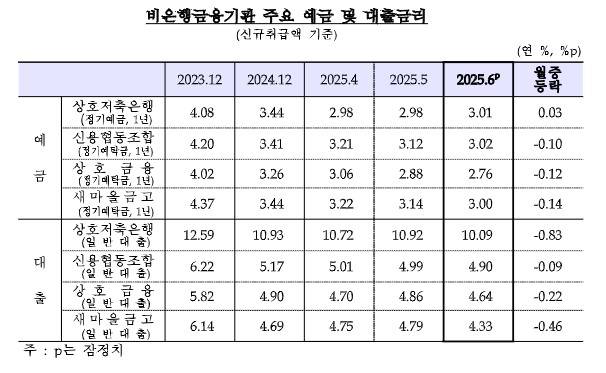 반면 신용협동조합은 3.02%로 한 달 전 3.12%에서 0.10% 떨어졌고 새마을금고는 3.00%로 한 달 전과 비교해 0.14%포인트 낮아졌다.