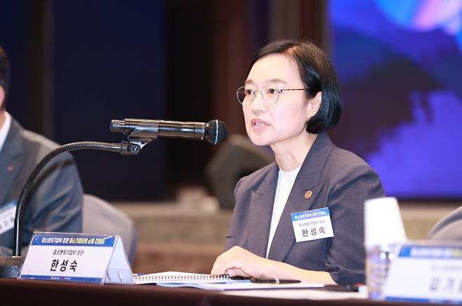[한성숙 중소벤처기업부 장관이 29일 서울 영등포구 중소기업중앙회에서 열린 '중소기업단체 소통 간담회'에서 모두 발언을 하고 있다. (중소벤처기업부 제공=연합뉴스)]