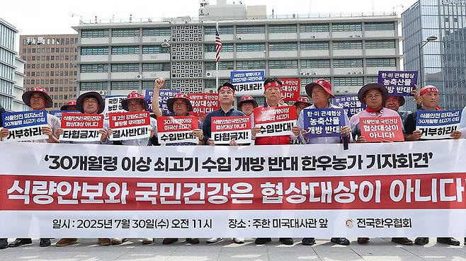 한우농가 8만 곳으로 이뤄진 전국한우협회는 오늘(30일) 종로구 주한미국대사관 앞에서 기자회견을 열어 "30개월령 이상 미국산 소고기 수입을 반대한다"며 "굴종적인 한미 관세 협상을 즉각 중단하라"고 촉구했습니다.
