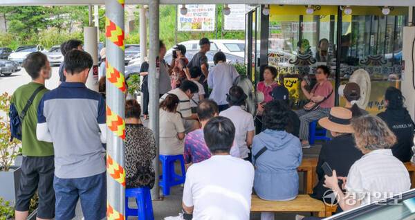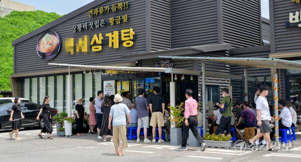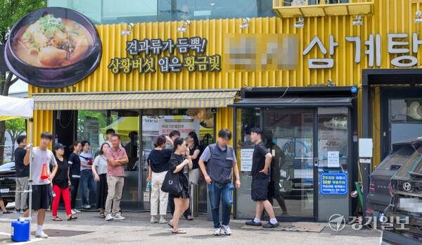 절기 상 중복인 30일 오후 수원특례시 한 삼계탕 집에서 시민들이 삼계탕을 먹기 위해 줄 서 있다. 조상들은 중복을 포함한 복날에 삼계탕, 백숙 등 닭을 이용한 음식 뿐 아니라 민어, 장어, 염소 등 다양한 보양 음식을 섭취했다.