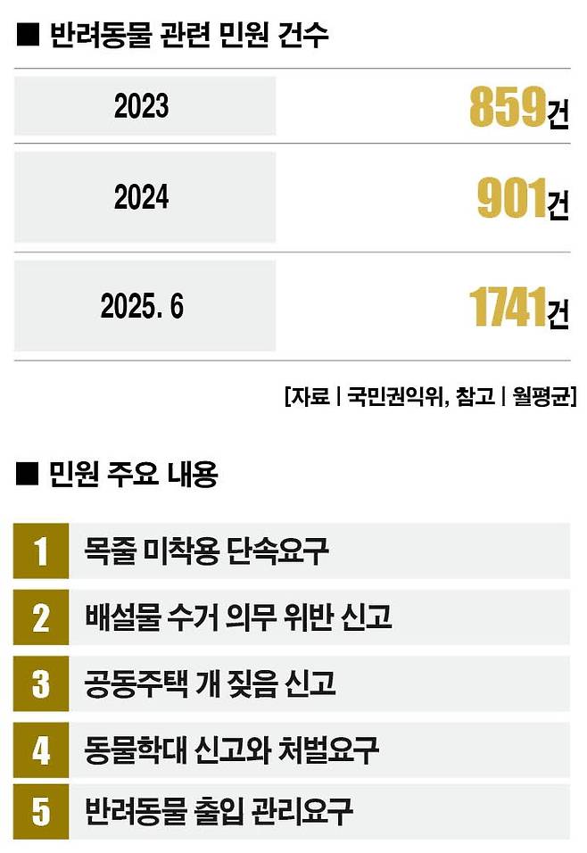 국민권익위원회가 분석한 반려동물 관련 민원 사례 중 일부 내용이다. 이처럼 산책하며 목줄을 채우지 않거나 배설물을 수거하지 않는 등 반려동물 관련 민원이 크게 늘어났다. 특히 1년 전인 2024년과 비교해 올해는 월평균 민원이 2배 가까이 급증하자, 정부가 '민원주의보'까지 발령했다.