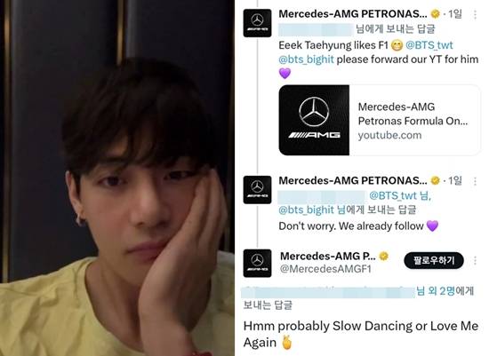 이후 F1 팀 중 하나인 메르세데스-AMG 페트로나스(Mercedes-AMG Petronas)의 공식 X는 해당 발언에 반응하며 "태형(뷔 본명)이가 F1을 좋아한다. 우리 유튜브 영상을 보내줘"라면서 공식 유튜브 계정을 공유했다.