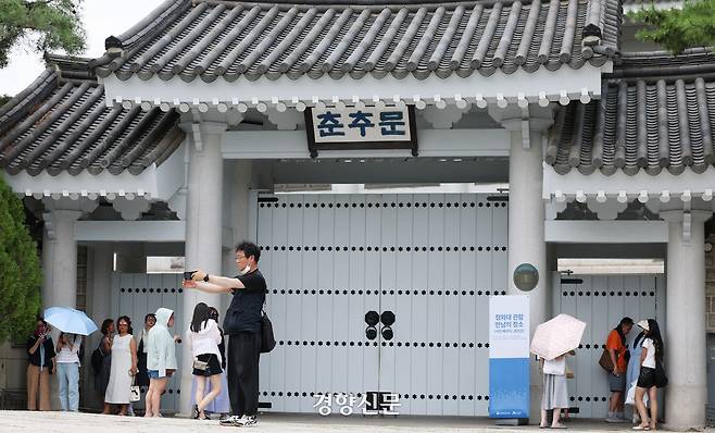 관람 종료를 앞둔 30일 서울 종로구 청와대는 사전 신청자만 입장이 제한적으로 허용됐다. 이날 시민들은 춘추문 앞에서 시간에 맞춰 단체로 입장했다. 입장하지 못한 시민들은 청와대를 배경으로 사진을 찍거나, 문 너머를 기웃거리며 주변을 둘러봤다.