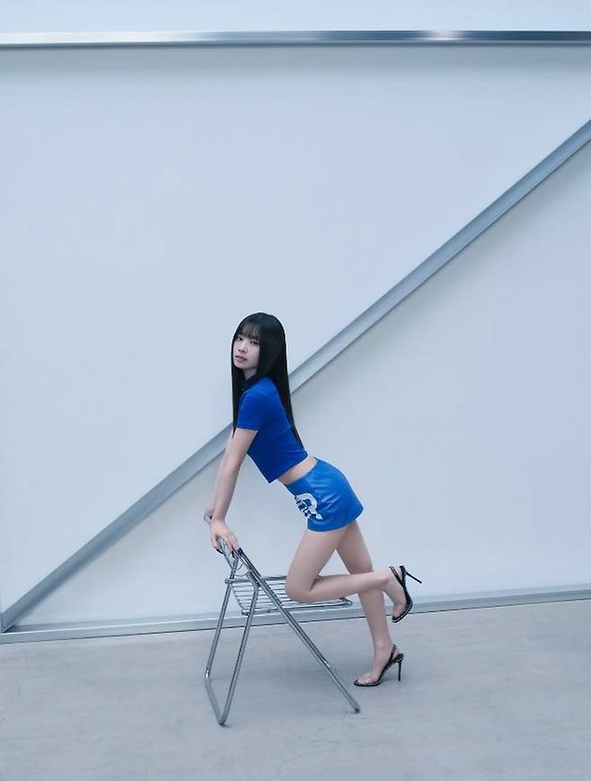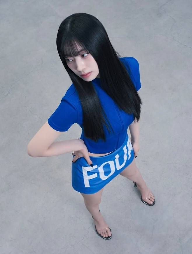 다현의 대담한 포즈와 함께 'FOUR'가 새겨진 블루 스커트와 상의가 강렬한 인상을 준다.
