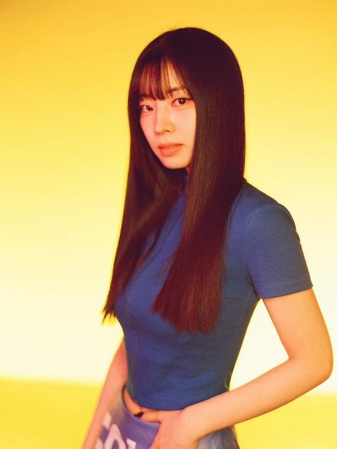 마지막 사진에서는 다현이 노란 배경 속에서 주는 카리스마가 돋보인다. 블루 톤의 의상은 어두운 색의 헤어와 대비를 이루며 독특한 매력을 발산한다. 세련된 의상과 분위기 속에서 다현은 대담하면서도 우아한 존재감을 드러낸다.