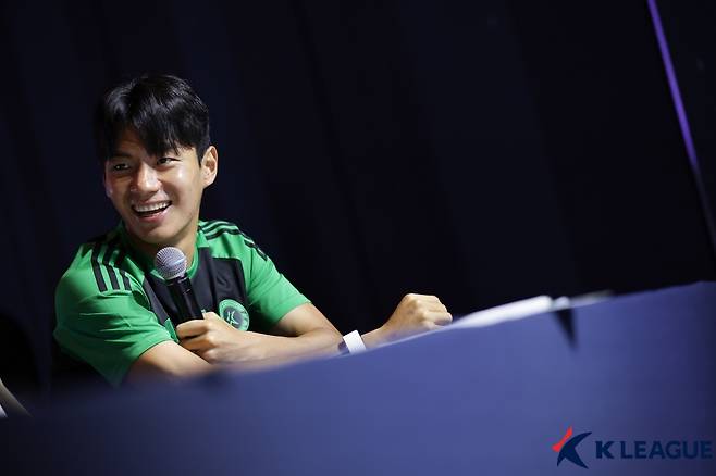 전진우는 30일 오전 수원에 있는 라마다프라자 수원 호텔에서 진행한 팀 K리그 선수단 사전 인터뷰에 참석했다. 전진우는 이번 시즌 리그 23경기 출전해 12골과 2도움을 올리며 리그 득점 1위에 있다. 마침내 잠재력이 터지며 전북 상승세를 이끄는 선봉장 역할을 톡톡히 해내고 있다.