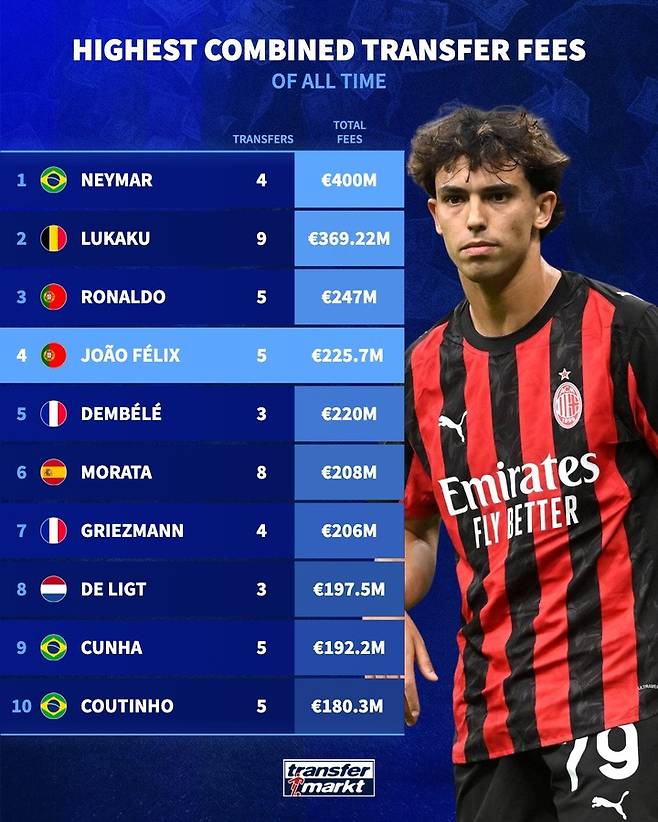 최근 주앙 펠릭스가 사우디 리그 알 나스르로 옵션 포함 5000만 유로(한화 약 798억 원)의 이적료에 합류가 확정됐다. 이에 따라 그의 누적 이적료는 2억 2570만 유로(한화 약 3604억 원)를 돌파한 것으로 알려졌으며, 이는 역대 누적 이적료 총합 4위에 해당하는 수치다.