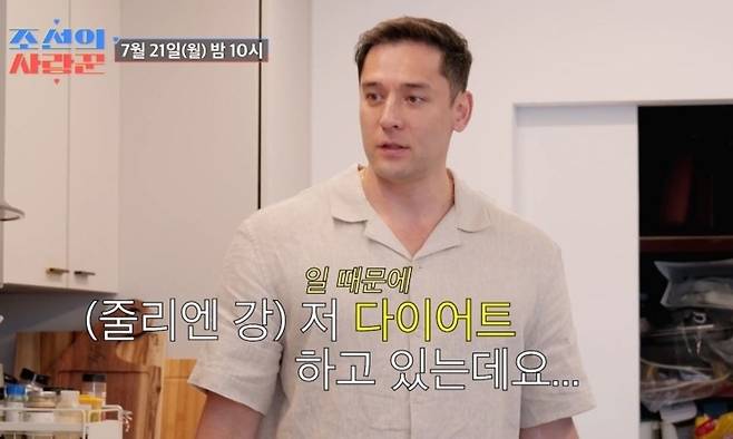 운동을 마치고 돌아온 줄리엔 강은 청소가 돼 있는 모습에 당황하며 아내 제이제이에게 전화를 걸었다. 줄리엔 강은 "청소 안 해주셔도 된다. 우리가 할 수 있다"고 목소리를 높였다. 이후에도 그는 "장모님 요리 너무 맛있어 보인다"면서도 자신을 위해 비빔국수와 부추전을 준비한 장모님 음식 대신 다이어트식을 먹는 모습을 보여줬다.