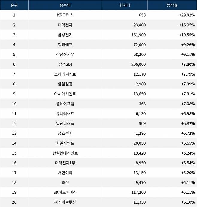 6위 삼성SDI(006400)는 종가 206,000원으로 7.80% 상승 마감했다. 7위 코리아써키트(007810)는 종가 12,170원으로 7.79% 상승 마감했다. 8위 한일철강(002220)은 종가 2,980원으로 7.39% 상승 마감했다. 9위 아세아시멘트(183190)는 종가 13,650원으로 7.31% 상승 마감했다. 10위 플레이그램(009810)은 종가 363원으로 7.08% 상승 마감했다.
