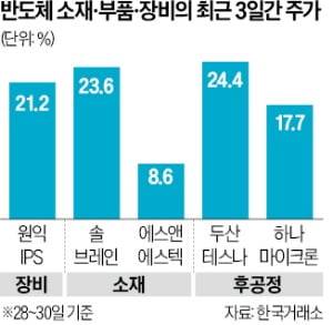 30일 한국거래소에 따르면 최근 3거래일 동안 KRX 반도체지수는 3% 넘게 올랐다. 전체 KRX지수 중 세 번째로 높은 상승률이다. 특히 반도체 장비 제조사 원익IPS 주가는 같은 기간 21.2% 급등했다. 반도체용 식각액 공급 업체 솔브레인과 후공정 업체인 두산테스나 주가도 각각 23.6%, 24.4% 뛰었다.