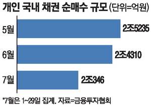 30일 금융투자협회에 따르면 개인의 국내 채권 순매수 규모는 5월 2조5235억원에서 6월 2조4310억원, 7월 2조346억원으로 줄고 있다. 올해 1분기까지만 해도 매월 평균 3조4000억원 규모를 순매수했지만 2분기 이후 순매수 강도가 눈에 띄게 약해졌다.