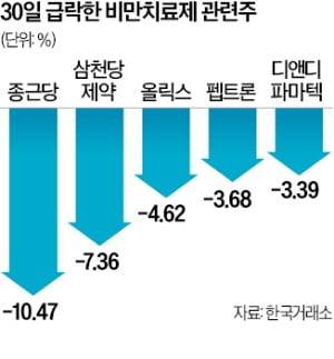 삼천당제약(-7.36%) 올릭스(-4.62%) 디앤디파마텍(-3.39%) 등 다른 비만치료제 관련주도 일제히 하락했다.