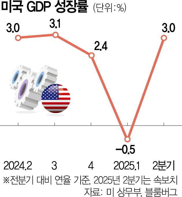 미 상무부는 올 2분기 국내총생산(GDP) 성장률(속보치)이 3.0%(전기 대비 연율)로 집계됐다고 30일 밝혔다. 블룸버그가 집계한 이코노미스트들의 예상치 2.6%를 크게 상회하는 수치다. 앞서 1분기에는 기업들이 고율 관세를 대비해 선제적으로 수입을 늘린 탓에 GDP 성장률이 -0.5%를 기록했다. 2022년 1분기(-1.0%) 이후 3년 만에 첫 역성장이라는 점에서 시장에 충격을 줬다. 하지만 2분기 수입이 줄면서 성장률이 반등한 것으로 보인다. 블룸버그통신은 “소비지출이 소폭 증가하고 수입이 크게 감소하면서 2분기 회복세를 보였다”고 설명했다.