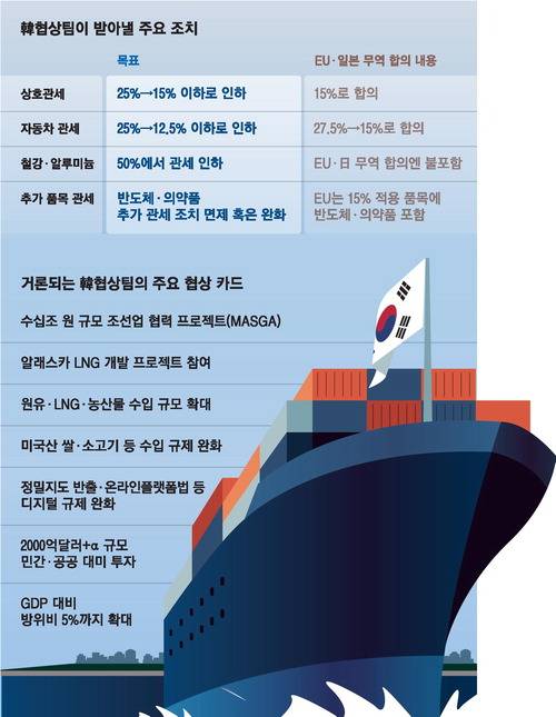 경쟁국이 무역 합의를 일찌감치 끝낸 점도 협상팀에 부담 요인이다. 미국이 예고한 대로 8월 1일 0시 1분(현지시간)에 국가별 상호관세가 부과된다면 우리 수출 기업은 경쟁국 기업 대비 10%포인트 높은 관세 부담을 지고 미국 시장에 뛰어들어야 한다. 한미 자유무역협정(FTA)으로 주요 공산품이 무관세라는 점을 감안하면, 현재 예고된 25%의 상호관세를 15%로 낮추고, 자동차 관세는 12.5%(일본·EU는 15%)까지 내려야 주요 수출국과 균형을 이룰 수 있다.