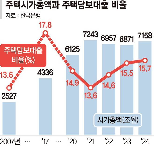 세부적으로 보면 한국은행이 발표한 2024년 말 기준 전국 주택시가총액은 7158조원이다. 같은 기간 주택담보대출 총액은 1123조원으로 단순 계산한 LTV는 15.7% 수준이다.
