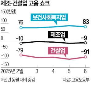 특히 고용 유발효과가 큰 제조업·건설업은 고용 쇼크가 이어지고 있다. 제조업은 전년 동월보다 9000명 줄었다. 2023년 10월 이후 21개월 연속 하향세다. 건설업도 9만1000명(6.2%)이나 줄었다. 도소매업(2만6000명·1.1%), 숙박음식점업(2만1000명·1.7%)도 감소했다.