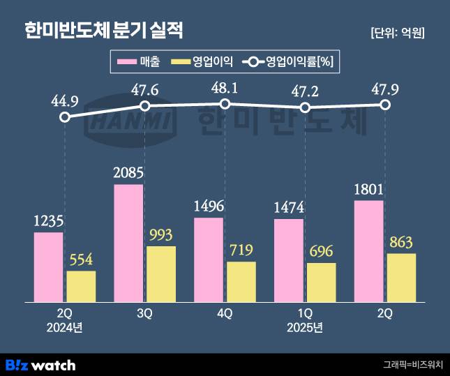 한미반도체는 올해 2분기 매출 1800억원, 영업이익은 863억원을 기록했다. 전년 2분기와 비교해 매출은 45.8%늘었고 영업이익은 55.7% 증가한 수준이다.