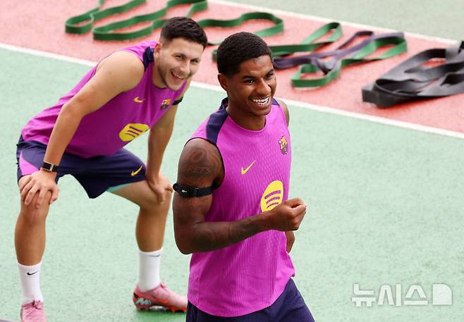 [고양=뉴시스] 조성우 기자 = FC바르셀로나 마커스 래시포드가 30일 오후 경기 고양시 고양종합운동장에서 훈련에 나서며 미소짓고 있다.