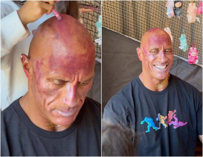 존슨은 29일(현지시간) 자신의 인스타그램에 두 딸 자스민(9)과 티아나(6)가 아버지의 얼굴과 머리에 직접 메이크업을 해주는 모습을 담은 영상을 공개했다. 영상 속 그는 얌전히 의자에 앉아 머리 전체가 반짝이는 핫핑크로 칠해지고 입술도 연한 분홍빛으로 물드는 과정을 묵묵히 받아들이는 모습이었다. 메이크업이 아닌 낙서같은 분위기.