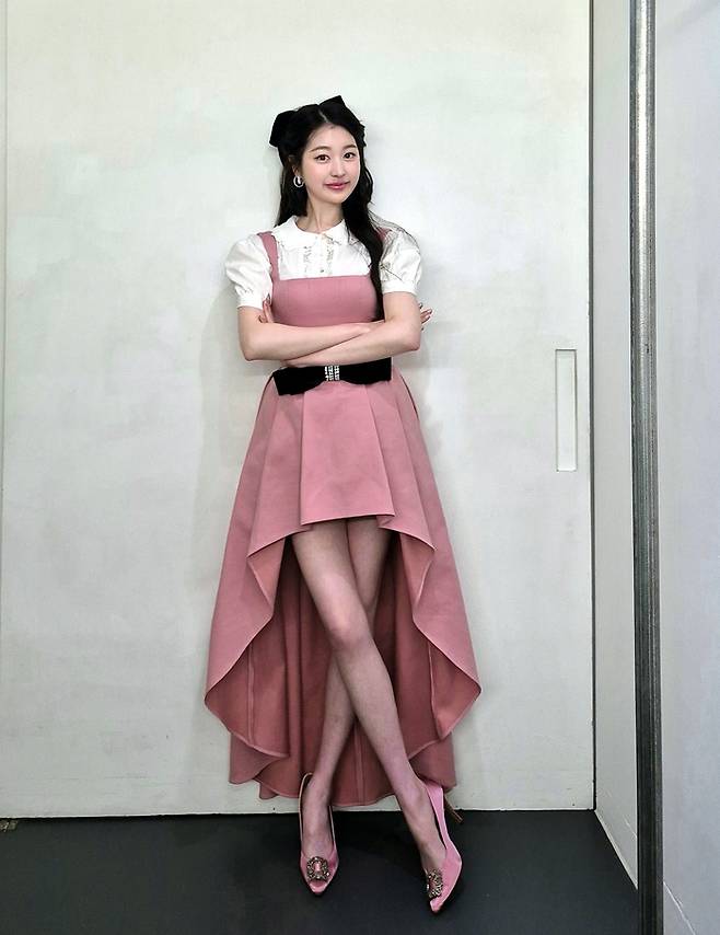 또한, 커다란 블랙 리본 헤어 액세서리와 반짝이는 이어링·네크리스 등 다양한 주얼리, 핑크 컬러 하이힐까지 더해져 소녀스러운 분위기를 극대화했다.