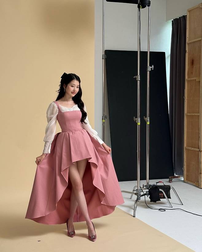 흰색 블라우스에 연한 핑크색 뷔스티에 원피스를 매치해 우아하면서도 사랑스러운 무드를 완성했다. 허리 라인을 강조한 디자인과 비대칭의 스커트 라인이 한층 더 길고 슬림한 각선미를 부각시켰다.