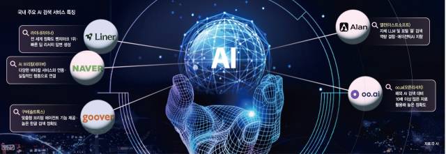 국내 대표적인 AI 검색 서비스로는 '라이너'(라이너)와 'AI 브리핑'(네이버), 구버(솔트룩스(304100)), 앨런(이스트소프트(047560)), oo.ai(오픈리서치)가 꼽힌다. 2023년 2월 출시된 라이너는 국내 1호 AI 검색 서비스로 볼 수 있으며, 이어 앨런(2024년 12월), oo.ai(2025년 3월), AI 브리핑(2025년 3월), 구버(2025년 6월)가 출시됐다.