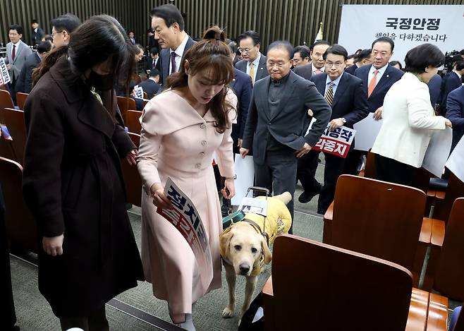 | ▲ 김예지 국민의힘 의원이 27일 오전 서울 여의도 국회에서 열린 의원총회에 새 안내견 ‘태백’과 함께 참석하고 있다. |