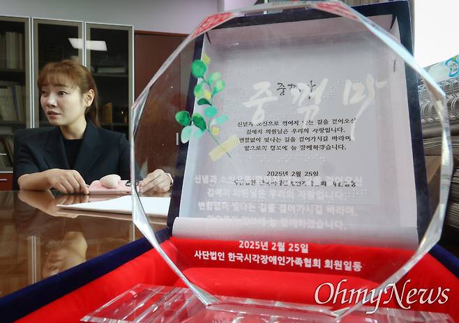 | ▲ 김예지 국민의힘 의원 집무실에 한국시각장애인가족협회로부터 받은 상패가 놓여 있다. |