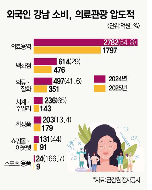 강남 지역 결제 증가를 견인한 건 뭐니 뭐니 해도 ‘의료 쇼핑’ 수요다. 글로벌텍스프리에 따르면, 강남 상권 의료용역 총 판매액은 지난해 상반기 179억원에서 올해 278억원까지 늘었다. 판매 건수는 16만건에서 19만5000건까지 증가했다. 절대 판매 건수가 늘어난 것은 물론, 올해 들어 건당 더 비싼 의료 시술을 많이 받았다. 같은 기간 백화점(48억원 → 61억원), 의류·잡화(35억원 → 49억원), 화장품(18억원 → 20억원) 결제도 늘었지만 의료용역에 비하면 그 증가폭이 작다.