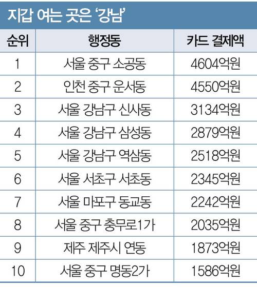 뒤를 이어 7위는 홍대 동교동(2242억원), 8위는 중구 충무로1가(2035억원), 9위는 제주시 연동(1873억원), 10위는 중구 명동2가(1586억원) 순이다. 주시태 나이스지니데이타 실장은 “공항 면세점 결제를 제외하면 외국인 소비가 가장 많은 지역이 강남”이라며 “관광은 강북에서 하고, 대형 쇼핑시설과 의료시설이 밀집한 강남으로 소비가 집중되는 모습”이라고 설명했다.