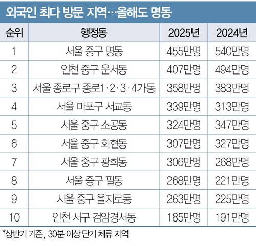 2025년 외국인 최다 방문지는 역시 서울 ‘명동’이다. LG유플러스에 따르면, 올해 상반기 명동을 찾은 외국인은 약 455만명(LG유플러스 로밍 사용자)이다. 2위 인천 중구 운서동(약 407만명)에 인천공항이 자리한다는 점을 감안하면 명동 방문객 수가 얼마나 많은지 가늠할 수 있다.