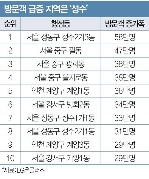 성수동 인기는 다양한 데이터로 확인 가능하다. 올해 상반기 성수동 외국인 카드 결제액은 1315억원. 지난해 같은 기간(403억원)과 비교하면 무려 226.3% 증가했다. 지난해 41위에서 16위까지 가파른 순위 상승이다. 방문자 수도 급증했다. 지난해 상반기 대비 올해 외국인 방문 수가 가장 많이 늘어난 행정동 1위가 성수2가3동이다. 해당 기간 58만명이 더 찾았다. 뿐만 아니다. 성수1가1동(7위, 33만명)과 성수2가1동(8위, 31만명), 성수1가2동(15위, 21만명)까지 더하면 150만명 가까이 늘었다.