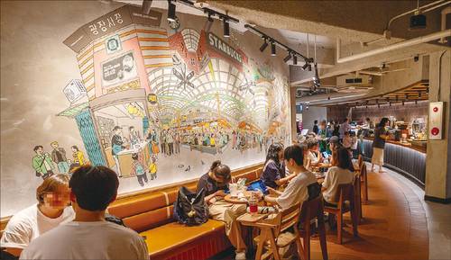 주요 브랜드도 광장시장에 속속 입점하는 모양새다. 대표적인 예가 올해 5월 문을 연 ‘스타벅스 광장마켓점’이다. 과거 포목점 건물을 탈바꿈한 3층 규모 매장은 광장시장만의 특색 있는 공간미가 가득하다. 2층에는 모시와 노방천으로 만든 아트웍과 상인을 그린 벽화가 걸려 있다. 메뉴도 차별화했다. 광장마켓점에서만 판매하는 ‘골든 만다린 홉 피지오’는 첫날에만 300잔 이상 팔리며 화제를 모았고, 이 밖에도 광장시장 명물인 호떡을 활용한 라떼, 디저트 ‘포목포 딸기 크레이프’도 인기 메뉴다.