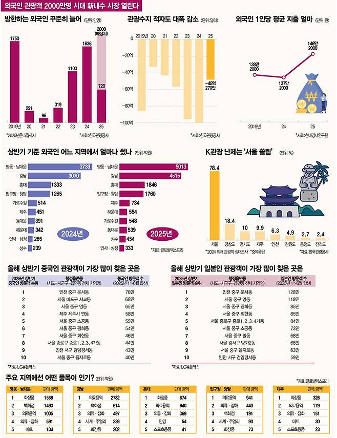 외국인이 서울 중심에서 벗어날 수 있게 유도하는 전략도 필요하다. 서원석 한국관광학회장(경희대 호텔관광대학장)은 “결제 편의성을 높이고 교통 접근성을 개선하는 등 지역 관광 인프라에 대한 전략적 투자로 외국인 수요를 전국 단위로 분산시켜 균형 있는 관광 소비 기반을 마련해야 한다”고 말했다.