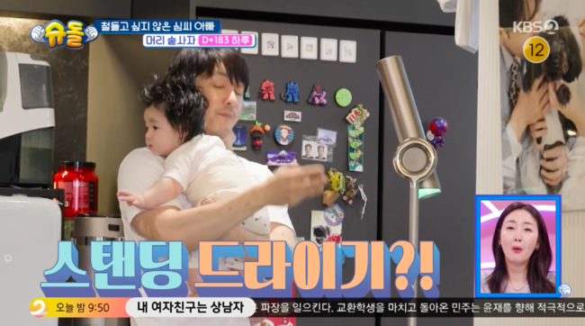 자유자재로 머리 모양을 내던 심형탁은 목욕 후 스탠딩 드라이기 앞에 섰다. 박수홍은 “나 처음본다. 애기 머리 말리는 거 처음본다”라고 놀랐고, 최지우는 “스탠딩 드라이기는 보통 머리숱 많거나 긴 머리 여성분들이 사용하는데”라고 감탄했다.