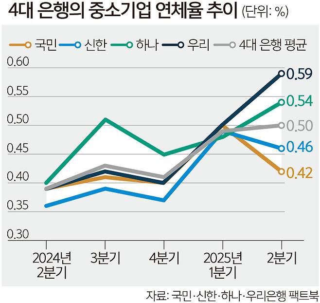 4대 은행의 중기 대출 연체율 평균은 2022년 2분기 0.2%로 떨어졌다가 2023년 0.3%대, 2024년 0.4%대를 넘어선 뒤 올해 2분기 말 0.5%까지 올랐다.