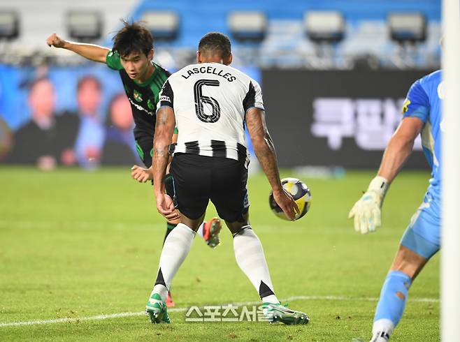 특히 중앙 성향이 강한 전북의 김진규와 김천의 이동경을 측면에 두면서 최전방 공격수 모따와 가운데서 연계 플레이를 지속했다. 이때 좌우 풀백인 토마스와 포항의 어정원이 측면으로 빠르게 올라서 지원 사격했다.