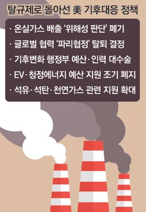 트럼프 대통령은 2기 취임 첫날부터 기후변화에 대한 미국의 약속을 폐기하고 파리협정 탈퇴를 명령했다. 아울러 메탄 누출 감지를 중단하고 전기자동차 인센티브를 삭감하는 등 환경 규제 철폐 행보를 이어가고 있다.