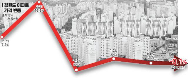 미분양은 올해 들어 감소세를 보이고 있다. 30일 통계청 국가통계포털에 따르면 지난 1월 강원 지역의 미분양 물량은 4197호에서 2월 4045호, 3월 3953호, 4월 3855호, 5월 3783호까지 줄어들었다. 다만 준공후 미분양은 해소되지 않은채 800호 전후를 유지하고 있다. 연도별로 봤을 때는 오히려 증가 추세다. 강원 지역 준공후 미분양 물량은 12월 기준 2022년 2648호에서 2023년 4001호, 지난해 4408호까지 늘었다. 준공후 미분양은 실수요자와 투자자 모두의 소비 심리를 위축시켜 주택시장 회복의 걸림돌로 작용하고 있다. 강원 지역은 현재 전체 미분양 물량의 상당 부분이 준공후 미분양 형태로 누적돼 지역 내 공급 과잉과 가격 하락 우려를 낳고 있다. 향후 가격 변동이 미분양 물량의 중요 변수로 작용할 것으로 예상된다.