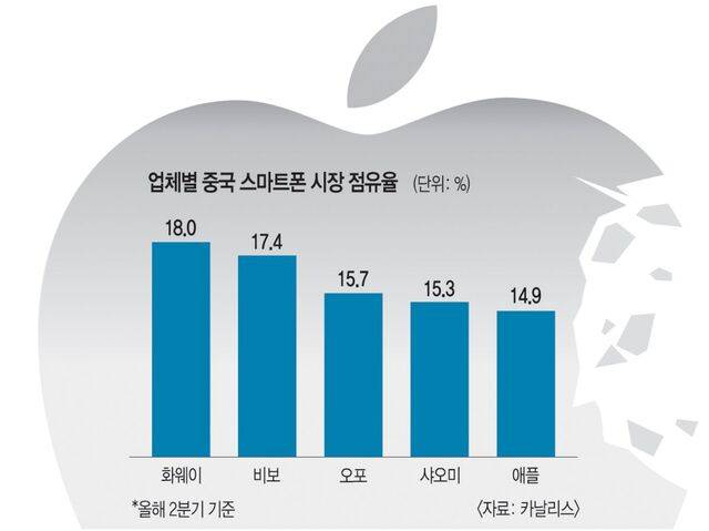 시장조사업체 카날리스에 따르면 올 2분기 중국 본토 스마트폰 점유율 1위 기업은 화웨이(18%·1220만대)였다. 이어 비보(17.4%·1180만대), 오포(15.7%·1070만대), 샤오미(15.3%·1040만대) 순으로 1~4위까지 모두 중국 토종 브랜드가 차지했다. 애플의 점유율은 14.9%(1010만대)로 5위에 머물렀다.