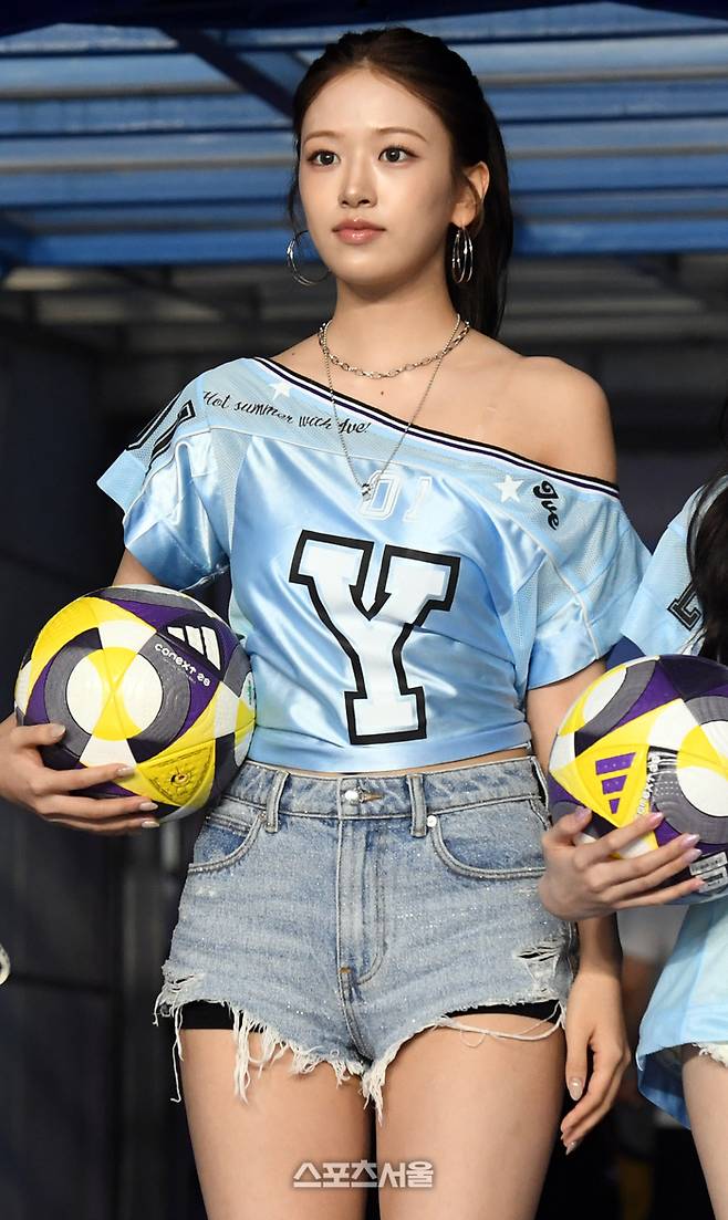 아이브 안유진이 30일 수원월드컵경기장에서 열린 2025 쿠팡플레이시리즈 팀K리그와 뉴캐슬 유나이티드FC의 친선경기에 앞서 시축을 위해 그라운드로 입장하고 있다. 2025. 7. 30.