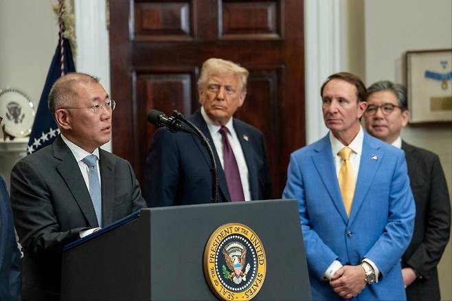 정 회장은 워싱턴에서 정부의 관세협상을 지원하면서 ‘발등의 불’인 자동차 품목관세(25%) 인하를 위해 미 행정부 인사들과도 접촉할 예정인 것으로 알려졌다. 경우에 따라 올해 3월 210억 달러(약 29조 원) 대미 투자 계획 발표 당시 자신을 백악관으로 초청한 트럼프 대통령을 다시 만날 가능성도 있다.